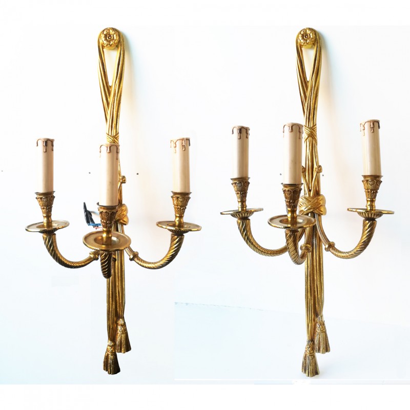 Pareja de apliques franceses de bronce dorado estilo Luis XVI o neoclasico del Siglo XX con tres brazos acabados en vela